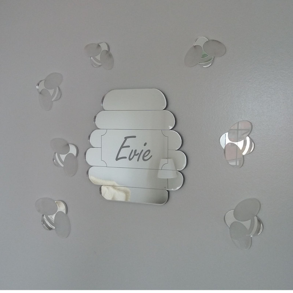 Honeypot and bee personalised name plaque set. Made from mirrored acrylic, this door plaque is a smart and gleaming edition to your child's room. The bees can be arranged so that they are buzzing around your honeypot plaque.