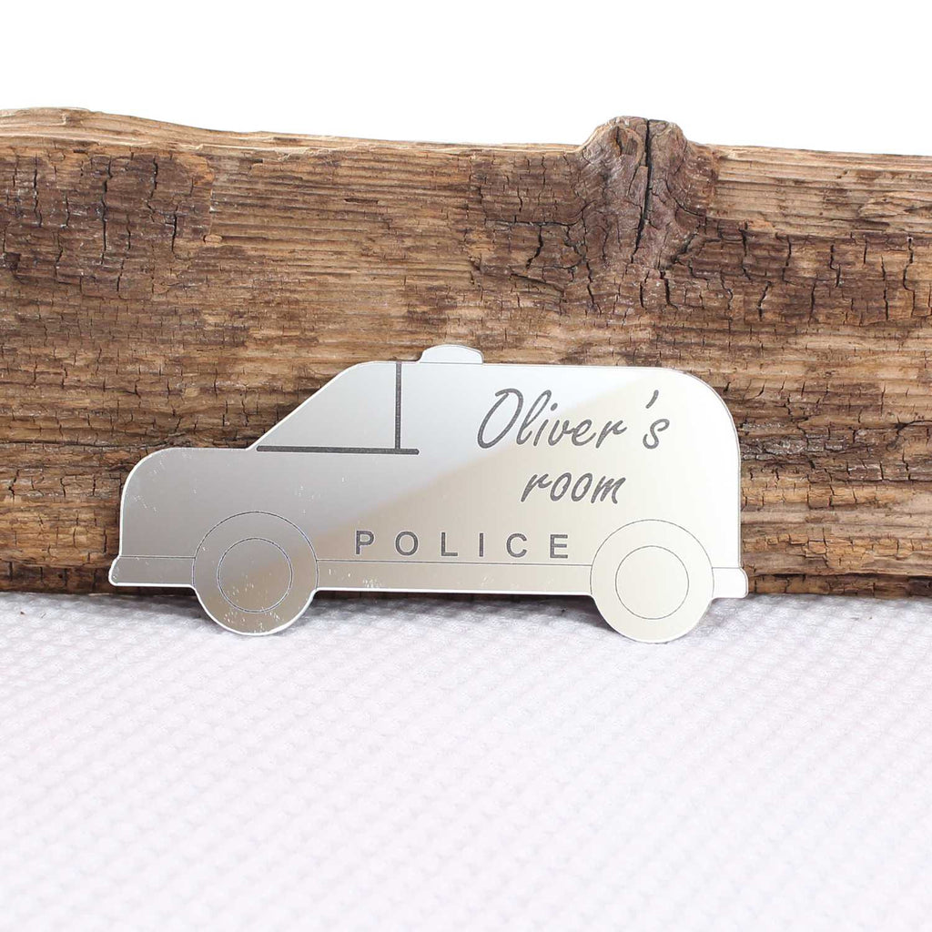 Police car personalised name plaque. Made from mirrored acrylic, this door plaque is a smart and gleaming edition to your child's room.