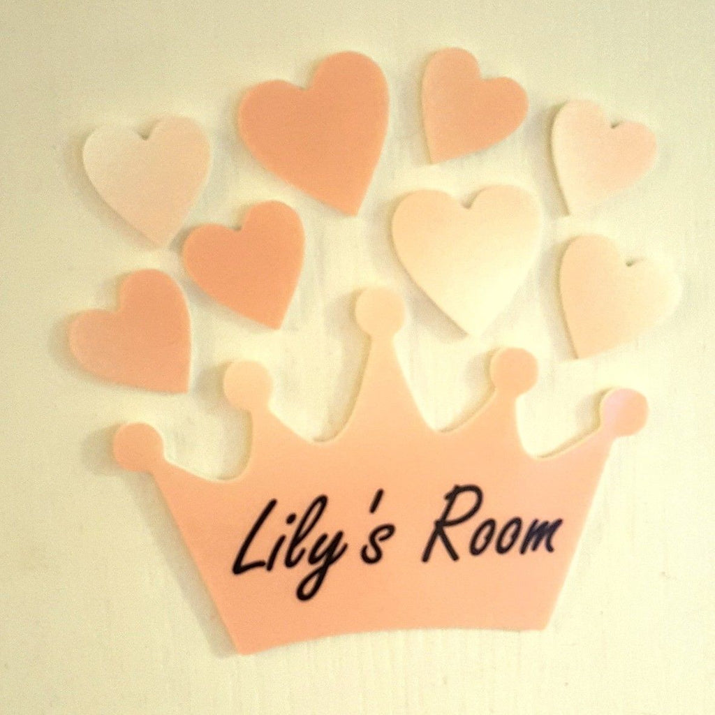 Princess Crown personalised name plaque set. Made from acrylic, this door plaque is a a pretty edition to your child's room. The extra hearts included can be positioned however you wish to really make your plaque personal.